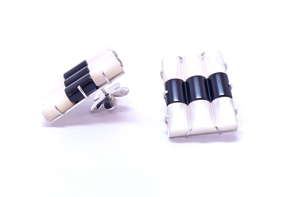 Mother of Pearl and Onyx Earrings in 18K White Gold